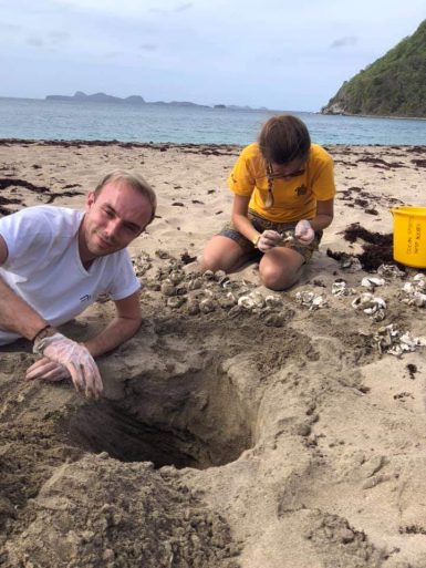 Nest excavations are something new I was also introduced to this week, which made the last few days all the more interesting. When we got out on a night survey we always leave a marker in the successful nests at night, in order to measure an accurate location for each nest in the morning using markers at the back of the beach (marker is later removed to prevent poaching). This is so that when we see a nest hatch and take a second measurement, we can look at when this nest was laid so we know when it’s safe to excavate (over 70 days from laying). When we then spot successive hatchling events from the same location, which usually start around 55-70 days from laying, we measure again and go locate the hatched nest during the day assuming it’s been over 70 days since the eggs were laid, to allow for all possible living hatchlings to emerge. The excavation process itself is pretty fascinating and involves a little bit of training to fully understand. Basically, once we find a previous nest that we know has had hatching events at least three times (Leatherback babies don’t all emerge at once they usually come out in 5-20 hatchling at a time over a week), we go and dig it up/excavate. This is probably one of the most interesting and most disgusting experiences I’ve had in my life, as it turns out over 50 days of baked eggs and turtles makes for quite the rotten smell and soup! A lot of the eggs come out hatched (our Leatherbacks have around a 35% hatch success rate), however many eggs we find unhatched or partially hatched with dead turtles. Unhatched eggs are counted and the stage of development at which the embryo got to is recorded. It’s incredibly interesting to see all the stages of Leatherback turtle’s creation from the nucleus, to the embryo, to turtles with egg sacks, to full-sized babies! If you’re lucky you may find a live turtle buried and be able to rescue it!